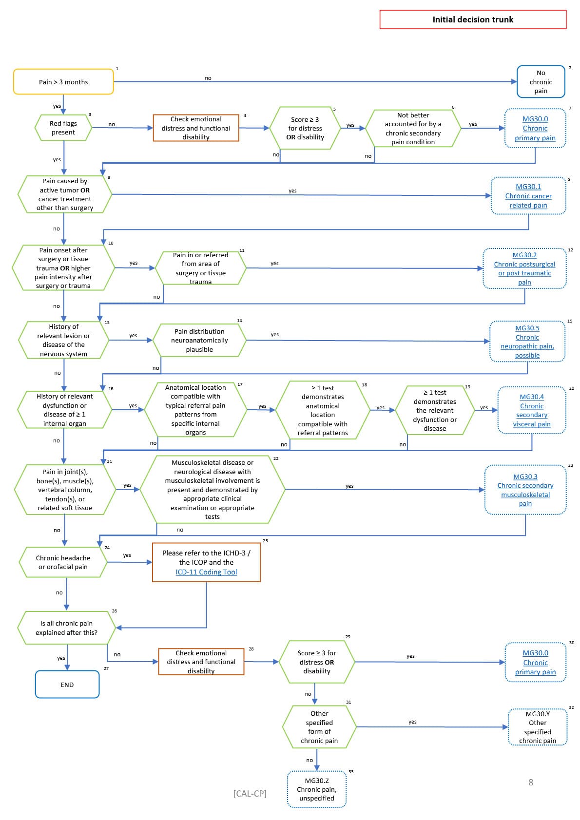 Počáteční rozhodovací kmen zahrnuje 7 hlavních kategorií chronické bolesti na první diagnostické úrovni a lze jej použít jako samostatný algoritmus v méně specializovaných zařízeních nebo v zařízeních primární péče: