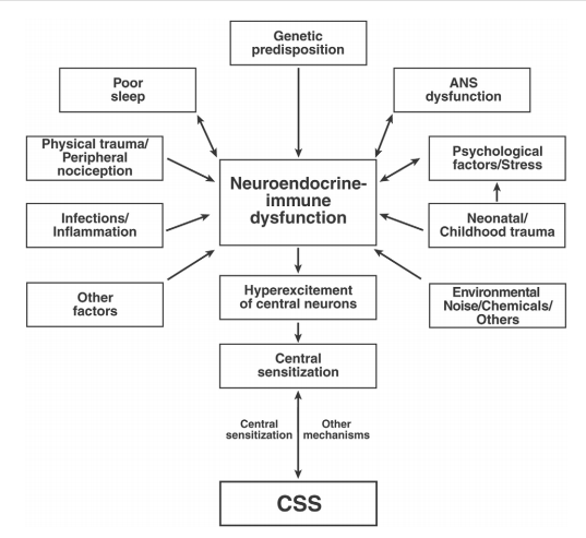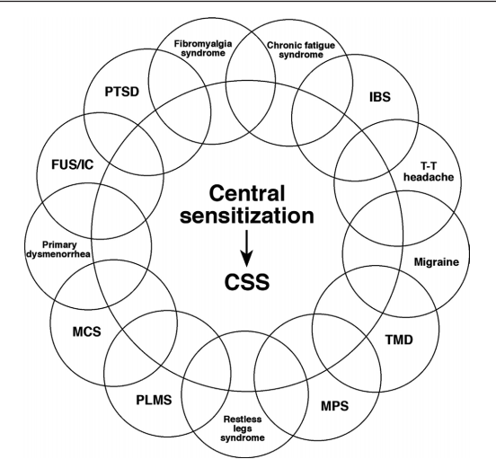 Jenže nemají žádné viditelné známky nemoci nebo úrazu, a proto se ti, kteří jimi trpí často cítí stigmatizováni poskytovateli zdravotní péče, rodinou a zaměstnavateli. Přitom nejde o žádnou ,,novinku´´ historicky byl koncept vzájemného propojení několika poruch CSS poprvé publikován v roce 1984 na základě předchozí demonstrace asociací několika zdravotních stavů ze skupiny CSS s fibromyalgií. Nemoci ze skupiny CSS jsou založeny na biologických i psychologických faktorech a tak je neopodstatněné zpochybňovat věrohodnost pacienta s CSS. A především rozpoznání centrální senzibilizace a to, zda je řízena pokračujícím nociceptivním vstupem nebo zda se vyskytuje v nepřítomnosti periferního ovladače je rozhodující pro účinné zvládání bolesti. Elektrická stimulace nociceptivního flexivního reflexu (NFR), funkční magnetická rezonance (fMRI) a kvantitativní senzorické testování (QST) poskytují neurofyziologické důkazy o centrální senzibilizaci u pacientů s fibromyalgií. NFR lze využít k hodnocení centrální alodynie u FM a k rozlišení pacientů, kteří mohou mít prospěch z užívání centrálně působících analgetik. https://pubmed.ncbi.nlm.nih.gov/12746916/